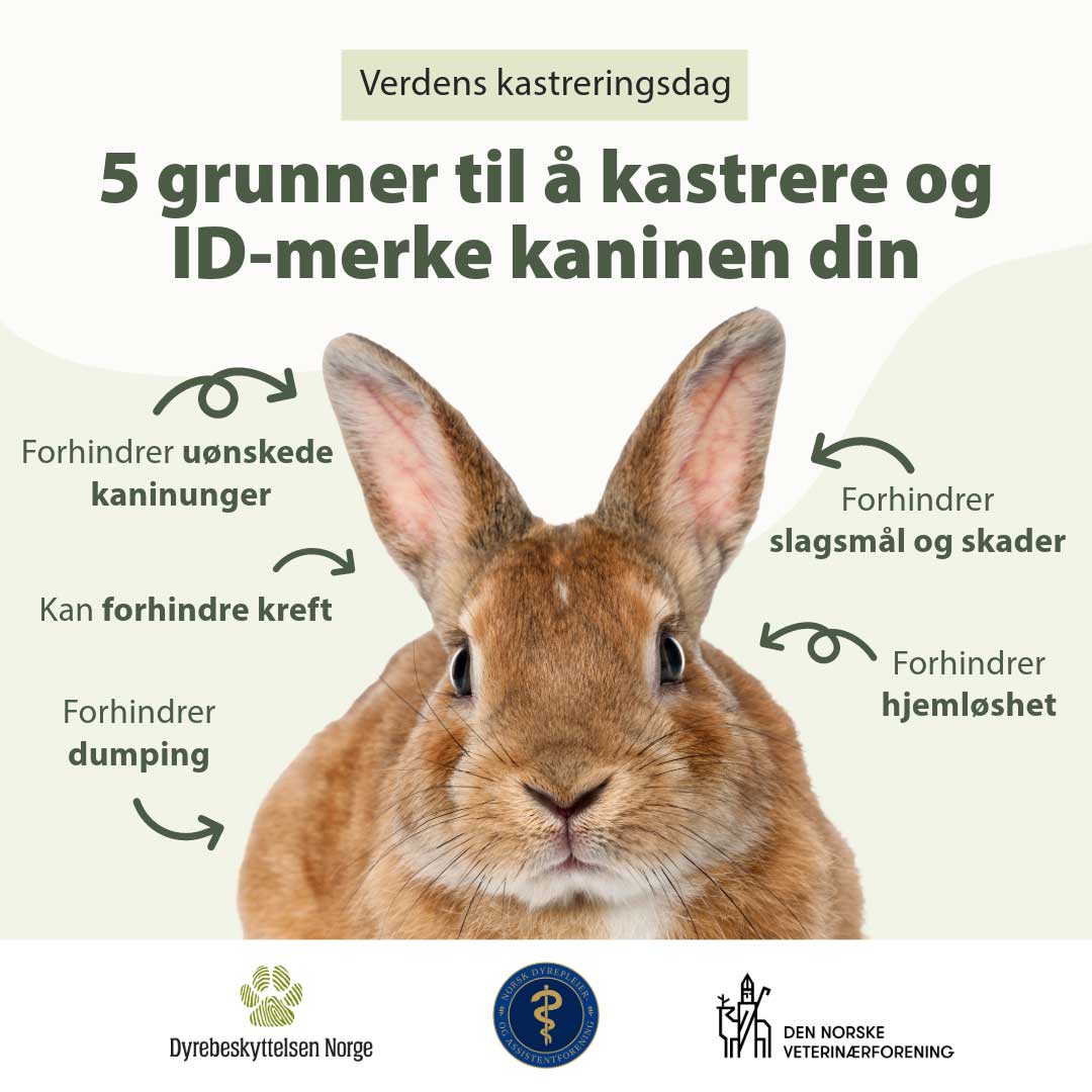 Du står også ansvarlig om dyret ditt blir drektig og får unger. Dyrebeskyttelsen Norge anbefaler derfor at alle katter og kaniner blir kastrerte og ID-merkede. Dette vil forhindre hjemløshet og kan i tillegg beskytte dyrene mot alvorlig sykdom og kreft.